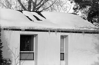 Photograph 1 shows a single story house with an ice dam. The points of heat loss can be clearly seen as those areas with no snow. The ceiling below this area needs to be examined for air leakage, missing or inadequate insulation, leaky or poorly insulated ductwork, and the termination of a kitchen or bathroom exhaust into the attic space.